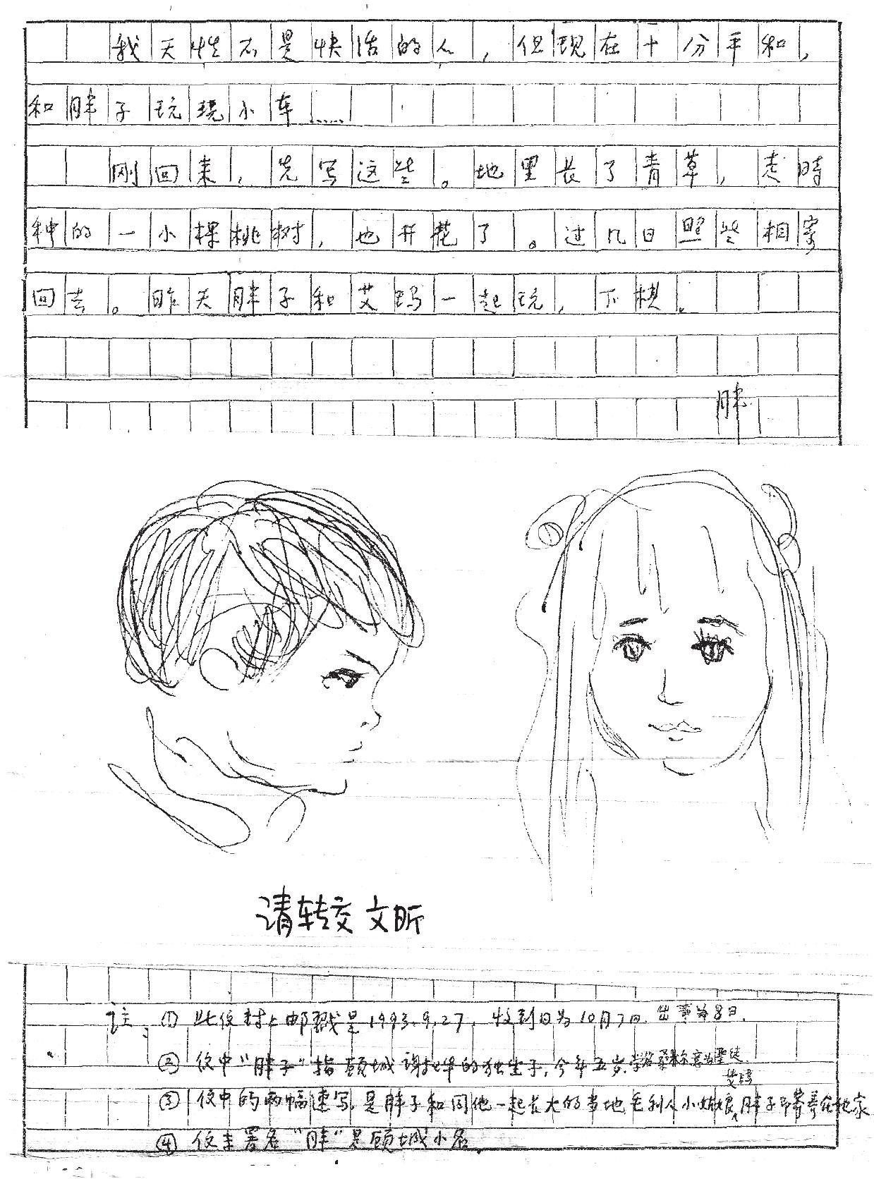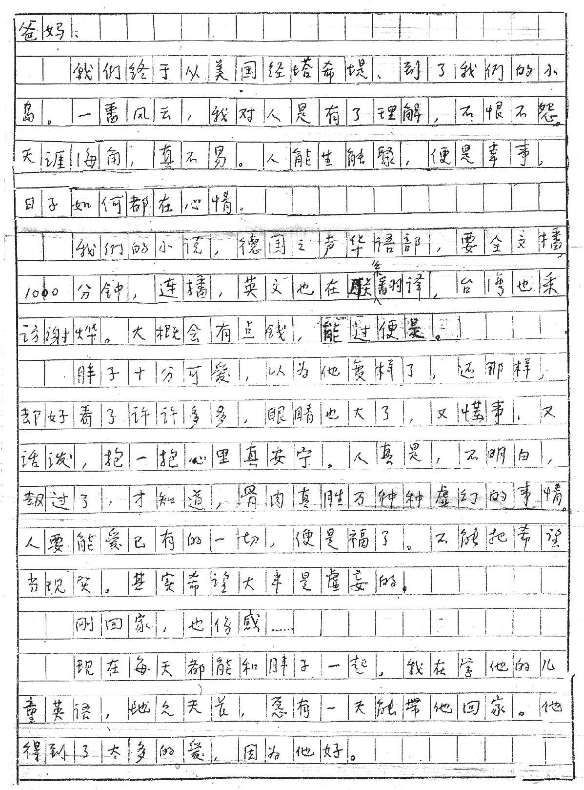 在顾城回到新西兰之后,他给父母写了封信,这是他人生最后寄出的信件之一。从这封信中,能够清楚地看出,顾城已经决意从感情的劫难中走出来,重新回到生活中来,支撑他的精神的是儿子: