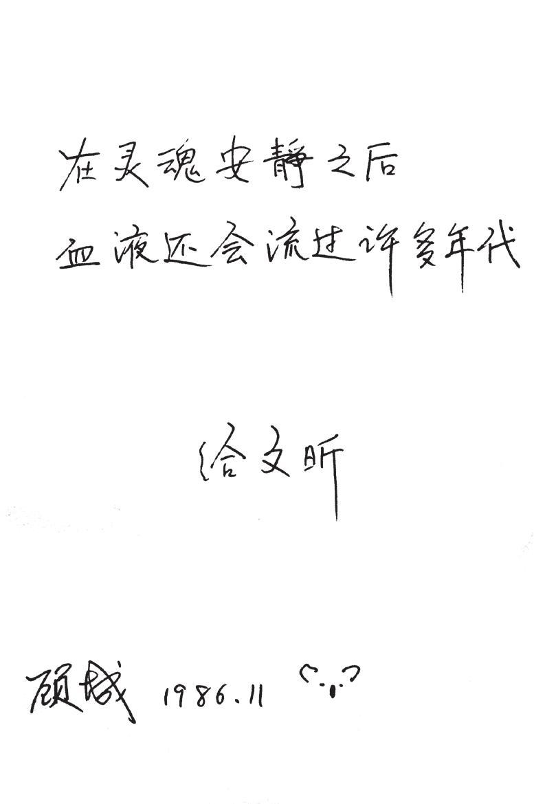 在灵魂安静之后 血液还会流过许多年代 ——引自顾城1986年11月送给笔者的 诗集《黑眼睛》扉页上的题字